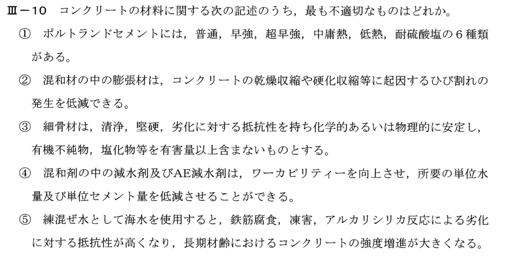 令和4年度技術士第一次試験[専門科目]_建設部門_Ⅲ-10の問題を解いてみます。コンクリートの材料について問われている問題です。