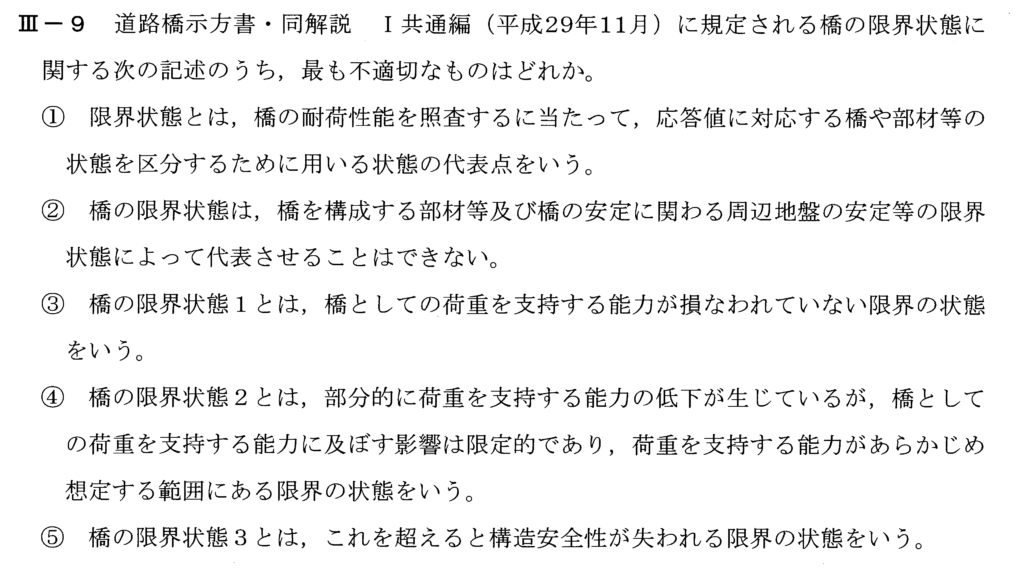令和4年度技術士第一次試験[専門科目]_建設部門_Ⅲ-9の問題を解いてみます。橋の限界状態について問われている問題です。